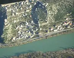 Walled town of Počitelj (Serbian Cyrillic: Почитељ) is a medieval fortified nucleus of Počitelj historic village, in the municipality of Čapljina, Bosnia and Herzegovina. Due to its significant architectural and urbanistic historical value, it is considered an open-air museum. The Walled town is nested in a natural karst amphitheater along the left bank of the Neretva river, on the main road Mostar-Metković. The walled nucleus is protected as a National Monument of Bosnia and Herzegovina. The architectural ensemble of Počitelj is also proposed as such for inscription into the UNESCO's list of World Heritage Sites. The bid for inscription is currently placed on the UNESCO Tentative list.