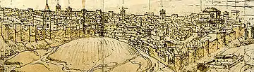 After the construction of the Medieval Walls, the city continued to grow eastward, with the population increasing from 5,000 to 12,000 inhabitants from the mid-15th to early 16th century. The suburbs, or arrabales, took their names from convents, hermitages and churches constructed outside the Muslim Walls in the 12th century.[12] The first of these, known from 1126, was the Arrabal of Saint Martin corresponding to the Convent of San Martín, followed by that of San Ginés by the Church of San Ginés de Arlés.[13]