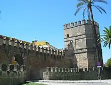 - • The areas of mud made by the Almohads, some visible, as in the calle Judería, and calle Agua and others that are not visible because these are hidden by buildings of Calle San Fernando -except in some that are public-. Parallel to the walls of the alcázar, was the walls of the city, whose remains were found during works of the Metro, leaving again buried.[8]