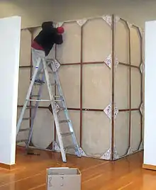 War Room is "a group of four eleven-by-eleven foot black canvases, each filling a wall of the room"[62] then arranged "into a square...in the shape of a room...and a door to go in it."[20] The installation has been described as a significant item of Bay Area art history.[63]