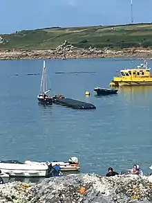 In May 2021, Wally the Walrus was seen in Les Sables d'Olonne in western France, where local wildlife experts feared he had been hit by a boat.[8] After a sighting in Bilbao, Spain, Wally was seen two weeks later near the Isles of Scilly, trying to mount boats near Porthcressa Beach, south of Hugh Town.[9] Wally was also pictured off St Martins, sleeping on a local fishing boat.[10] While in the Isles of Scilly, Wally the Walrus sank and damaged several boats, leading local groups, including the British Divers Marine Life Rescue, Devon and Cornwall Police, RNLI, Isles of Scilly Wildlife Trust, and St Mary’s harbour authority, to come up with a plan to humanely remove or deter Wally from the harbour.[11] Wally was also given a purpose-built pontoon in St Mary’s harbour to bask on and to act as a safe space, which would also deter him from mounting boats, which would damage them.[12] He left the Isles of Scilly after nearly three months in early August.[13]