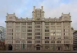 1906 | This is an office building on the site of the former Tower of Liverpool, with crenellated turrets providing a link to this. It is one of the earliest steel-framed buildings in the country, and is clad in white glazed terracotta.[4][12][13] | II* |