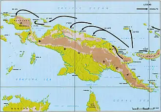 Over the next few months, the tempo of operations increased, forcing the Sixth Army to plan and execute multiple operations simultaneously.[56] Operations Reckless and Persecution in April 1944 together comprised the largest operation yet in SWPA, with the 24th and 41st Infantry Divisions of Lieutenant General Robert L. Eichelberger's I Corps landing at Tanahmerah and Humboldt bays near Hollandia, while the 163rd Regimental Combat Team landed at Aitape.[57] Eichelberger was Krueger's most senior subordinate, but when he did not meet Krueger's expectation, Krueger let him know in no uncertain terms. "In my more than 40 years as an officer", Krueger told one of his staff, "I have never raised my voice to an enlisted man, but a corps commander should know better."[58]