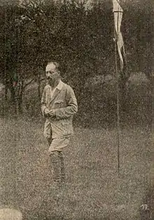 The Wandervogel was officially established on 4 November 1901 by Karl Fischer (1881–1941) in Steglitz, a suburb of Berlin, under the name "Wandervogel Committee for Schoolboy Excursions" (Wandervogel, Ausschuß für Schülerfahrten), with four of his friends, along with four writers from the city and a medical doctor.[6] This group served as a juridical and financial patronage, and they were not involved in the movement activities, which were led by Fischer under the title of Oberbachant.[4] Prussian law did not allow young people to establish their own clubs or join extracurricular ones. The association was therefore presented by Fischer as a respectable hiking club to parents and Prussian citizens. A former teacher of the Steglitz Gymnasium, the reform pedagogue Ludwig Gurlitt (1855–1931) helped the movement get officially recognition by the Prussian Ministry of Culture by leaving a favorable report. Fischer had been a fervent follower of Hoffmann-Fölkersamb, his right-hand-man during various treks, and eventually took over the leadership when Hoffmann-Fölkersamb left Berlin at the end of 1899 for a diplomatic career in Constantinople.[11] As Fischer failed his Abitur twice, he had to wait until 1901 to completely focus on the movement, to the detriment of his studies in law and sinology. By 1903, there were already groups in Berlin, Posen, Munich, Hamburg and Lüneburg, organizing regular hikes.[4]
