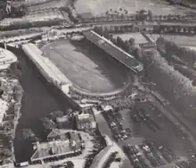 The stadium was constructed on an area of unused land south of the Wandsworth reservoir between Garratt Lane (formerly South Street) and Buckhold Road. Just to the south was King Georges Park (a public nursery, tennis courts, bowls green, swimming and paddling pools). This tranquil setting was unfortunately ruined by an unsightly storm relief sewage aqueduct that ran straight over and through the middle of it.[2]