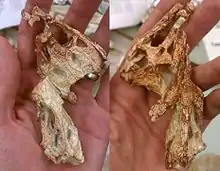 The skulls are described as "low and broad", and are small; SMU 76604 is estimated at 64 millimetres (2.5 in) long, and SMU 76605 is estimated at 62 millimetres (2.4 in) long. The lower jaw lacks external mandibular fenestrae, and the third tooth of the maxilla (main tooth-bearing bone of the upper jaw) and the fourth tooth of the dentary (tooth-bearing bone of the lower jaw) are enlarged. The teeth become broader and less conical going back toward the jaw joint, and the teeth at the anterior end of the lower jaw project forward (the anterior end of the upper jaw, composed of the premaxillas, is not known). Features of the skull and vertebrae indicate that the individuals are subadults. Adams performed a phylogenetic analysis and found Wannchampsus kirpachi to be a derived paralligatorid, closely related to the "Glen Rose form", which he regarded as belonging to the genus Wannchampsus.[2]