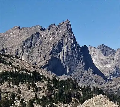 War Bonnet Peak (12,487 feet (3,806 m)) is located in the southern Wind River Range in the U.S. state of Wyoming. War Bonnet Peak is on the southern side of the Cirque of the Towers, a popular climbing area, rising steeply above Jackass Pass.[3] War Bonnet Peak sits along the Continental Divide, less than 1 mi (1.6 km) across Jackass Pass from Mitchell Peak.