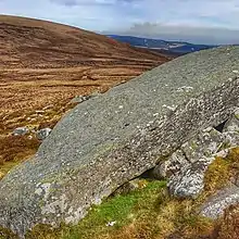 In the saddle between War Hill and Djouce lies a cluster of boulders known as the Coffin Stone at O178104.[8] Records from Irish Mountaineering Club note that according to J.B. Malone, these stones were the only natural rock-feature recorded on the old "O.S. Sheet 16, half-inch-to-the-mile map" of Dublin and Wicklow mountains.[7] The large 5-metre collapsed boulder is speculated as being an ancient Irish megalithic portal tomb, or possibly, a glacial erratic.[8][11]