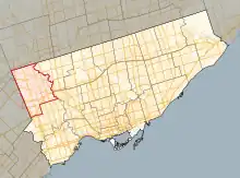 Etobicoke North is part of the Etobicoke and York community council.[6] The ward occupies the northwestern part of Toronto. The eastern boundary is the Humber River from Steeles Avenue south to a point just to the east of the Dixon Road. The southern boundary runs west from the Humber River along Dixon Road to Martin Grove Road to Eglinton Avenue to the western limit of the city. The western and northern limits of the ridings are formed by the city limits.[3]