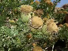 The erect flowerheads stand individually at the tip of the stems or with two or three together. Each is 3–4 cm long, 4½–6 cm wide, and contains disk florets only. The common base of the florets (or receptacle) is flat with indents where the florets are inplanted, while scales and hairs are absent. The bell-shaped involucre consists of four to five rows of green bracts, sometimes tinged purple at the stretched tip and with a papery irregularly fine dentate edge. The bracts in the outer row are 6–7 mm long and 1½–2 mm wide, while bracts in rows further up are increasingly long, eventually reaching 21–23 mm. Each head carries twenty five to forty florets.[1]