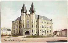 The old Warren High School was built in 1896-97 and was located in the city of Warren at the corner of 2nd Avenue and Market Street.