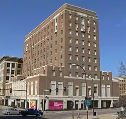 The building is eleven stories tall, and rises 128 feet (39 m) above the ground.[2] The building was designed by Kansas City architect Alonzo H. Gentry in the Art Deco style. The brick exterior features terra cotta ornamentation. The hotel opened on December 20, 1930, built by the Eppley Hotel Company.[3] Eppley was bought by Sheraton Hotels in 1956, and the hotel was renamed the Sheraton-Warrior.[3] Sheraton remodeled the hotel in 1962, moving the lobby from the second floor to the ground floor and converting the hotel to a motel, renaming it the Sheraton-Warrior Motor Inn.[3] In 1968, Sheraton sold the hotel to Gotham Hotels Limited, along with seventeen other aging properties, and it was renamed the Warrior Motor Inn.[3] The hotel closed in 1971 following a strike by employees, but was sold and reopened the following year as the Aventino Motor Inn.[4] It closed permanently in 1976.[5] It was listed on the National Register of Historic Places in 1985.[1]