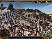 Warrior Kings: Battle is a real-time strategy game meaning much of its gameplay is focused on gathering resources and training and management of units for combat against opposing players.[1] There are three types of resources to harvest; food, materials and gold but are not available until they are dropped off at a village and then transported via cart to the main base or warehouse.[2] The later two are gathered from the surrounding environments like forests and mines while food is grown and harvested from built farms with speed of growth depending on how fertile the land beneath it is.[2] A proportion of the food delivered by farmers is removed when they deliver to a village or drop off point representing your fighting units' consumption of food. The proportion removed is reliant on how many farms you have working compared to number of food consuming units.[2] While villages and other resource-based buildings can be built anywhere other than within the base's walls, most military and economy based structures can only be built there, with each added building expanding the walls.[3] There is also a mana bar present on some special units (this is notably absent from all renaissance units) with the ability to use magic. Additionally, some special structures such as the empire cathedral and pagan temple have mana bars that can be refilled through prayer or sacrifice of units depending on the alignment.[4]
