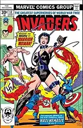 To celebrate the capture of superhero team the Invaders (in a prison in Berlin), Hitler insists Koenig and Master Man marry, his logic being that they are the progenitors of a new race. The ceremony, however, is interrupted when the priest is killed by rubble from a building damaged during a battle between the Invaders and German troops. Warrior Woman and Master Man retreat when confronted by the Human Torch, who becomes enraged when his ward, Toro, is wounded by gunfire.[4] The character reappears in the final issue of the Invaders as part of a team formed by the Japanese spy Lady Lotus to battle the heroes - the Super-Axis.[5]