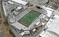 - ↑ The FCS playoff participant Tennessee State Tigers football program plays its home games in the 69,143-seat Nissan Stadium, but it is not "on-campus" - the criteria applied here. The stadium was built by local government, primarily as the home field of the NFL's Tennessee Titans, some 4 miles (6.4 km) from the Tennessee State University campus.