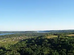 Washington County lies on the east side of Minnesota. Its east border abuts the west border of the state of Wisconsin (across the St. Croix River). The Mississippi River flows south-southeastward west of Washington County, and forms the southwest border of the county as it flows toward its confluence with the St. Croix (at the county's southernmost point).[11] Washington County terrain consists of low rolling hills, sloping to the south and east, with its highest point on the lower west border at 1,053 ft (321 m) ASL.[12] The county has a total area of 423 square miles (1,100 km2), of which 384 square miles (990 km2) is land and 38 square miles (98 km2) (9.1%) is water.[13] It is the fourth-smallest county in Minnesota by land area and fifth-smallest by total area.