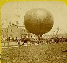 The construction of an immense balloon of cotton twill was carried to completion. But before the inflation some differences arose between the aeronauts regarding the reliability of the balloon. Donaldson's inexperience placed him in a secondary position throughout the entire transaction, but when the time for action came he found himself the principal, Wise having withdrawn. The dimensions of the balloon were enormous enough to be beyond the capabilities of Donaldson's management at that time. Three unsuccessful attempts were made at inflation, the balloon bursting each time, when finally the aeronaut Samuel Archer King was sent for, and the work was accomplished.[2]
