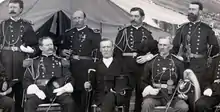Military leaders of the Washington National Guard pictured at Camp Murray in 1892; in the center is Governor Elisha Ferry.