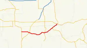 SR 260 begins at an intersection with SR 17 west of Connell in rural Franklin County. The highway travels east and turns southeast into Connell, traveling over a rail line owned by BNSF Railway and used on the Amtrak Empire Builder route between Pasco and Spokane.[3][4] After intersecting U.S. Route 395 (US 395) in the busiest section of the entire route, a diamond interchange that received a daily average of 2,800 vehicles in 2011,[5][6] the roadway continues east through the Washtucna Coulee and passes south of Sulphur Lake before entering Kahlotus. As SR 260 passes through Kahlotus, it forms the southern terminus of SR 21, going north towards Lind, and the northern terminus of SR 263, serving the Lower Monumental Dam. The road exits the city travelling east to Lake Kahlotus and Washtucna Lake, paralleling the Columbia Plateau Trail northeast to the beginning of a concurrency with SR 261.[7] The two highways enter the Adams County city of Washtucna and become Main Street before an intersection with SR 26, where SR 260 ends and SR 261 continues to Ritzville.[1][8]