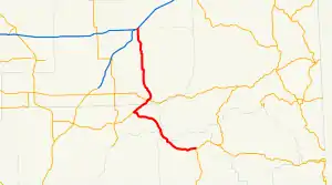 SR 261 begins its 62.71-mile-long (100.92 km) route at an intersection with US 12 east of the town of Starbuck in rural Columbia County.[1] The roadway travels north over the Pataha Creek and turns west, paralleling the Tucannon River through Starbuck and to the south bank of the Snake River. The highway passes over a rail bridge owned by the Washington State Department of Transportation before turning northwest and crossing the steel cantilever Snake River Bridge, listed on the National Register of Historic Places, into Franklin County near Lyons Ferry Park.[3][4][5] At the north end of the bridge, SR 261 continues northwest, passing under a Union Pacific Railroad bridge and near Palouse Falls State Park,[3][6] before crossing the Columbia Plateau Trail and intersecting SR 260 northeast of Kahlotus.[7] A concurrency with SR 260 travels northeast into Adams County parallel to the Columbia Plateau Trail in the Palouse before entering Washtucna and being designated as Main Street.[1][7] Main Street intersects SR 26, forming the eastern terminus of SR 260, after the Columbia Plateau Trail turns east. SR 261 continues north into farmland and crosses the John Wayne Pioneer Trail in Ralston before its northern terminus at a diamond interchange with I-90 and US 395 southeast of Ritzville, becoming Division Street as it serves the city.[8][9]