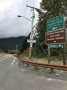 State Route 906 Spur (SR 906 Spur) is a 0.43-mile-long (690 m) spur route located entirely within the unincorporated community of Hyak, Kittitas County. It branches from its parent just before SR 906's eastern terminus at I-90.[1] The highway travels southeast, between I-90 and the Iron Horse Trail, and ends at a WSDOT maintenance facility located at the north end of Keechelus Lake. The old Chicago, Milwaukee, St. Paul & Pacific Railroad-Hyak Depot is accessible from SR 906 Spur, which now acts as a trail head for the Iron Horse rail trail.[18] WSDOT conducts a series of surveys to measure traffic volume in terms of AADT and calculated that 300 vehicles-per-day used the spur route in 2012. This number has remained steady between 2009 and 2012.[9]