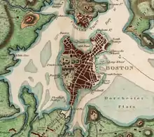 Until 1803 and the commencement of large-scale infilling of Boston Harbor and Back Bay, the town lay at the end of a peninsula less than a hundred feet wide at its narrowest point.[2] This was the waist of the strip of land known as Boston Neck. Originally a single street traversed the Neck, joining peninsular Boston to the mainland. This was termed Orange or South-End Street. The route served as the first leg of the Boston Post Road to New York City. Starting in 1631 the narrowest waist of that isthmus was cut to make the town more defensible. To this end fortifications south of Boston were built to control the Post Road, both on the mainland and just beyond the man-made canal cutting through Boston Neck at what is now Back Bay (see map at right). These fortifications were gradually improved over the years, and considerably expanded by the British as the movement for colonial independence moved from widespread discontent to frank military revolution.