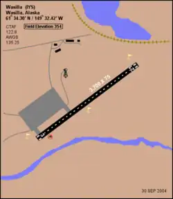 Wasilla Airport (IATA: WWA[2], ICAO: PAWS[3], FAA LID: IYS) is a city-owned public-use airport located about 3.5 miles (6 km) west of the central business district of Wasilla, a city in the Matanuska-Susitna Borough of the U.S. state of Alaska.[1] Wasilla is 17 miles by air and 47 miles by road from Anchorage,[4] the largest city in Alaska.