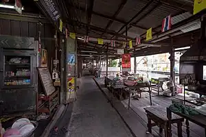 In the market, there are many restaurants with many kinds of modern and traditional food. Also, there is a traditional retail store selling antique appliances, toys, snacks from 20–30 years ago that are rare in the present market. There is a Thai traditional clinic to cure diseases by using Thai herbal treatment and Thai massage. Another zone of the market is a relaxation area with a variety of trees and flowers where tourists can rest. In addition, there are an art exhibition gallery for people who enjoy artwork and a local museum that tells the story and the lifestyle of people in this community in the past.[3]