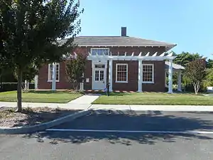 Water Mill station originally opened 1875 on the west side of Halsey Lane (now Old Mill Road), and served the Sag Harbor Branch. On June 1, 1895, the Long Island Rail Road built the Montauk Extension east of Bridgehampton, New York, transforming the line into the Montauk Branch.[2] The station was moved to its current site in August 1903,[3] and had a connecting road along the line to Deerfield Road which was eliminated sometime after the station was closed, but has since been rebuilt as the former station and surrounding land was converted (in the early 2010s) into an office complex. The station was closed in the 1940s, but continued to be used as a stop until 1968.[4] Unlike the nearby Bridgehampton station, which was razed in 1964 and replaced with a shelter in 1968, Water Mill station continues to stand well after it was closed by the Long Island Rail Road, and operated as a restaurant for much of the late-20th Century. Today it serves as the office of a series of office condiminums.[5][6]