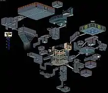 The Water Temple originally appeared in the 1998 Nintendo 64 video game The Legend of Zelda: Ocarina of Time. It is one of the levels that the protagonist Link explores as an adult.[1] The temple was constructed to worship water spirits and was guarded by Zoras.[2] It is found in Lake Hylia, which is at the time cursed by antagonist Ganondorf and an entity in the Water Temple.[2][1] The dungeon is located underneath Lake Hylia and is a large, multi-leveled dungeon. Players raise and lower the water level in wings of the dungeon to access new areas.[2] Link utilizes equipment to navigate the dungeon, including Iron Boots, a tunic that allows him to breathe underwater, and a Hookshot to hook onto distant objects.[2][3] Link battles his alter-ego Dark Link in the Room of Illusion, which features shallow water and a lone tree on a patch of land.[4] At the end, Link faces the dungeon's master, Morpha, a large water amoeba creature.[4] Upon its defeat, Link warps to the Chamber of Sages, where the Sage of Water, Princess Ruto, bestows onto him the Water Medallion. Afterwards, Lake Hylia returns to normal. Another version of Ocarina of Time was released called The Legend of Zelda: Ocarina of Time Master Quest, which features harder versions of each dungeon, including the Water Temple.[1] Game director Eiji Aonuma cited his love for deep-sea diving as his inspiration for the Water Temple, utilizing diving-based puzzles to reflect this.[5]