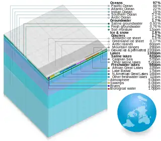 The total volume of water on Earth is estimated at 1.386 billion km³ (333 million cubic miles), with 97.5% being salt water and 2.5% being freshwater. Of the freshwater, only 0.3% is in liquid form on the surface.[2][3][4]