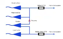 A schematic of the Worth Valley reservoirs and their drinking water supply. All reservoirs feed the River Worth - Watersheddles and Ponden directly and Keighley Moor and Lower Laithe by North Beck and Sladen Beck respectively.[30]