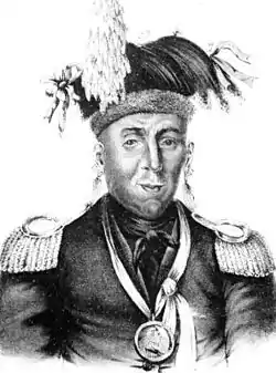 When the Black Hawk War erupted in 1832, Waubonsie and other Potawatomi leaders worked to keep their people out of the conflict, but found it difficult to do so.[6] Many white settlers, recalling the Fort Dearborn massacre, distrusted the Potawatomis and assumed that they would join Sauk leader Black Hawk's uprising.[7] Potawatomi leaders worried that the tribe as a whole would be punished if any Potawatomis supported Black Hawk. Waubonsie and Potawatomi chief Shabbona told Black Hawk that they would not come to his aid.[8] Hoping to demonstrate their good intentions to the Americans, the Potawatomis offered military assistance, fielding a force under Billy Caldwell and Waubonsie. They were less than enthusiastic allies, but managed to demonstrate support for the Americans while avoiding battle.[9]