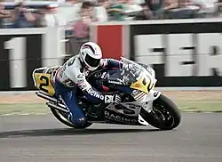 Gardner's performance earned him full support in 1986 from the Honda-HRC factory racing team alongside teammate Freddie Spencer.[6] He won his first Grand Prix race at the Spanish Grand Prix, before going on to win two more races and finish second in the championship behind Eddie Lawson.[2] In 1987, Gardner became the first Australian to win the 500 cc World Championship, winning seven of sixteen races and wrapping up the title with a win in the penultimate round in Brazil at Goiânia.[2] Gardner's race engineer in 1987 was fellow Australian Jeremy Burgess who had previously worked with 1985 World Champion Freddie Spencer.