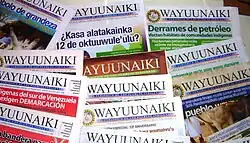 Founded in 2000,[1] Wayuunaiki is distributed in Venezuela and Colombia, especially in those regions where the Wayuu people reside. Its founder and current director is Jayariyú Farías Montiel.[2] In 2010, the newspaper was nominated for the "IPDC-UNESCO Prize for Rural Communication",[3] and was awarded fourth place.[4]