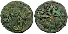 Two types of coins bear his name, one in silver, the other in copper. The silver issue bears the crowned bust of the king with the inscription in Ge'ez "King Wazena" on the obverse, a cross with a gilded punch hole center under an arch with the inscription in Ge'ez "The king who exhales the Savior." The copper issue bears a draped profile wearing a head-cloth and holding a stalk of wheat, sometimes topped by a cross with the inscription in Ge'ez "May this please the peoples" on the obverse, while the reverse bears a large cross crossed by an oblique cross with a gilded punch hole center and the inscription "of Wazena, of the King."[2] The legend on the obverse may be a translation from the familiar Greek phrase "May this please the country" used on many earlier issues, the previous instance by Kaleb on his rare bronzes.[3]