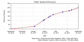 Between September 2016 and January 2017, "Weak" amassed 30 million streams,[19] amassing 70 million more streams in the next two months.[14] While climbing Billboard charts,[20] the band released the music video for "Weak" in March,[15] further pushing the song onto the Hot 100.[21] Metro named AJR their artist of the day on March 13, 2017.[22] After performing the song on Today in April,[23] the song was released to the radio for airplay and charted further.[24] The song's success additionally attracted the attention of Rivers Cuomo, frontman of rock band Weezer, who then collaborated with AJR to produce the song "Sober Up".[25] "Weak" accumulated more than 250 million streams after a year of its release,[26] with Apple Music including "Weak" on its "Best Alt Songs of the 2010s" playlist.[27]