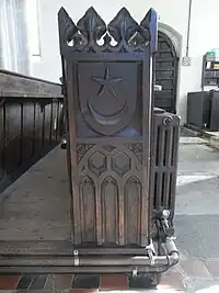 The Trewin (or Treawyn, etc.) family, alias "de Weare", are said to have used fishes as an heraldic device, in reference to the fish-weir within the manor and such devices are sculpted on the spandrels of the western arch of the western porch to the Hall.[5] The arms of William Trewin alias Weare (d. 1421) are shown in the 4th quarter of the escutcheon on the monumental brass depicting Richard Fortescue (d.1570) in Filleigh Church: Argent, on a bend vert between six crosses crosslet fitchee gules three crozier heads or.[6]