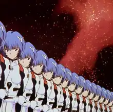 An image of Rei Ayanami's inner monologue. Several images of the girl put in a row appear during Rei's stream of thoughts, described by critic Dennis Redmond as reminiscent of 1970s science fiction.