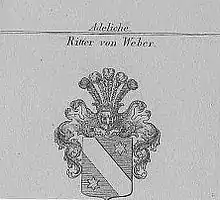 Bavarian hereditary nobility and knighthood (Ritter) on 30 April 1845 in Munich for his son Karl Weber, a royal Bavarian government secretary, 1st class in Augsburg with enrollment in the knightly class on 27 June 1845.