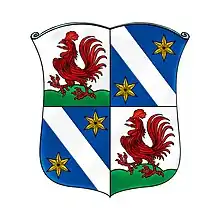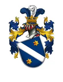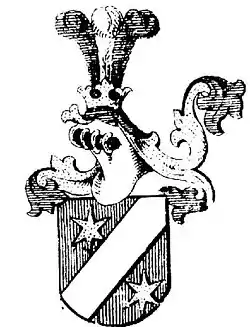 1813: Azure between two mullets or a bend argent. Mantling: gules and argent. Crest: five ostrich feathers, azure-or-or-or-azure.(See Genealogisches Handbuch des Adels, below.)