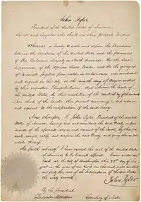 The Webster–Ashburton Treaty, signed August 9, 1842, was a treaty that resolved several border issues between the United States and the British North American colonies (the region that became Canada). Signed under John Tyler's presidency, it resolved the so-called Aroostook War. The provisions of the treaty included: