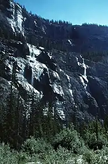 In spring and summer, the faces of the cliffs are usually covered with a series of cascading waterfalls. In winter, the waterfalls freeze into towering pillars of ice and become a well-known site for ice climbing.[4]