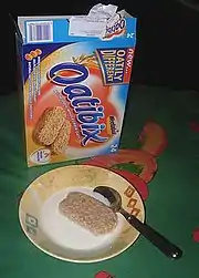 Weetabix is a breakfast cereal produced by Weetabix Limited in the United Kingdom. It comes in the form of palm-sized (approx. 9.5 cm × 5.0 cm or 4" × 2") wheat biscuits. Variants include organic and Weetabix Crispy Minis (bite-sized) versions.[1][2] The UK cereal is manufactured in Burton Latimer, Northamptonshire, and exported to over 80 countries.[3] Weetabix for Canada and the United States is manufactured in Cobourg, Ontario, in both organic and conventional versions.
