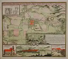 Wülzburg is a historic fortress about 2 kilometres (1.2 mi) east of the centre of Weißenburg. It stands on a hill 200 metres (660 ft) above Weißenburg, at an elevation of 630.5 metres (2,069 ft), and was originally a Benedictine monastery dating from the 11th century. It was converted into a fortress from 1588 to 1605 and is one of the best-preserved Renaissance fortresses in Germany. Today it is part of the city of Weißenburg.