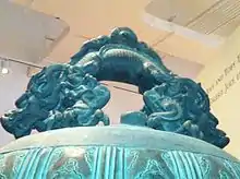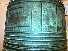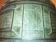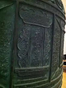 On the top of the Bell, a 2-heads-no-tails dragon appears, with four legs and five toes on each leg. The wall is divided into panels and bands by raised lines and filled with cartouches containing a dedicatory inscription. Around the lower edge, the eight trigrams in a band separated by cloud, and a band of waves runs around the lower edge.[1] Most of the text is from the Sutra of the Names of the 35 Buddhas and the Vinaya Sutra.