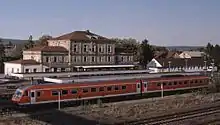 The Bavarian Eastern Railway Company (Bavarian Ostbahn) gained the concession to build the line was on 3 January 1862.[2] Construction began later that year and was completed on 1 December 1863.[3] From Schwandorf station to Irrenlohe station its single track ran parallel with the also single-track Regensburg–Schwandorf–Amberg–Nuremberg line of the Eastern Railway.[4] It ended in its own station in Bayreuth south of the former Brandenburger Thor (Brandenburg Gate, the location of the station of the state railway, the current Bayreuth Hauptbahnhof), which had a roundhouse, a goods shed, a carriage shed and a residential block for railway officials. To reduce costs, however, passenger traffic was handled from the beginning at the platform of the Bayreuth–Neuenmarkt-Wirsberg railway.[5]