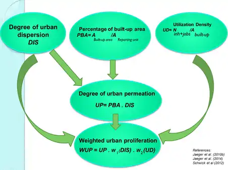 Weighted urban proliferation (WUP) is a method used for measuring urban sprawl. This method, first introduced by Jaeger et al. (2010),[1] calculates and presents the degree of urban sprawl as a numeric value. The method is based on the premise that as the built-over area in a given landscape increases (amount of built-up area), and the more dispersed this built-up area becomes (spatial configuration), and the higher the uptake of this built-up area per inhabitant or job increases (utilization intensity in the built-up area), the higher the overall degree of urban sprawl.[2]