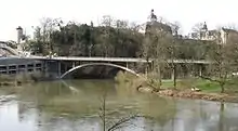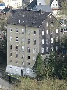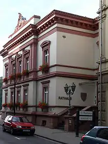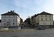 During World War II, in 1939–1941, it was the location of the Oflag IX-B prisoner-of-war camp for Polish and Belgian officers and orderlies.[4] In the war, the town sustained only light damage. The middle façade of the palace's orangery collapsed after an aerial bomb meant for the Weilburg railway station fell right in front of the gate and exploded. The railway station and the nearby Helbig brewery house were also damaged. While United States troops were taking over the town on 27 March 1945, the fighting caused some light damage, although all the town's bridges were blown up by retreating German troops.