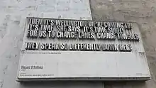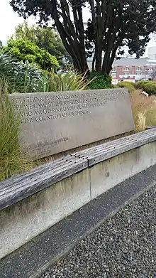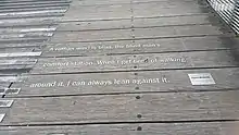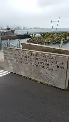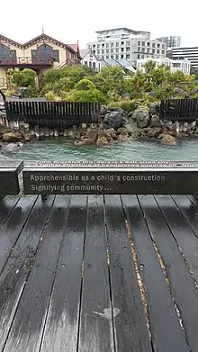 The Wellington Writers Walk is made up of a series of 23 quotations from New Zealand writers, including poets, novelists, and playwrights. The quotations are placed along the Wellington waterfront, from Kumutoto stream to Oriental Bay, in the form of contemporary concrete plaques or inlaid metal text on wooden 'benchmarks'.[1][2][3][4] They were designed by Catherine Griffiths and Fiona Christeller and installed to honour and celebrate the lives and works of these well-known writers, all of whom had (or have) some connection to Wellington.